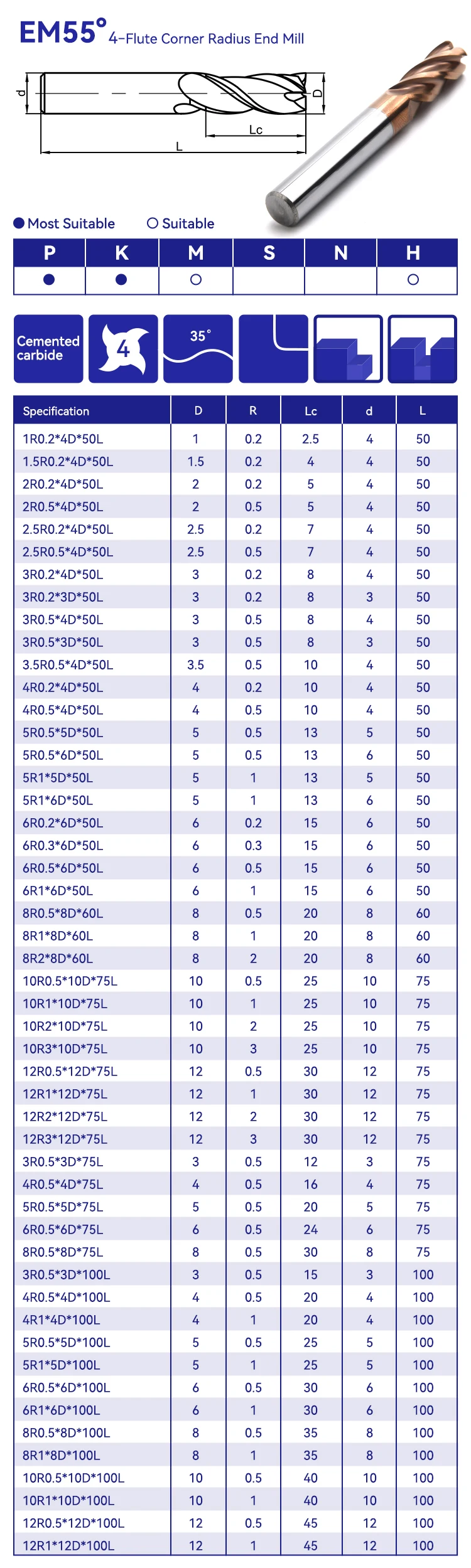 Pabrik TG 550 Series Pelapisan (4 Flutes Sudut Radius Kepala) Alat Pemilingan Benang End Mill Kustom ODM OEM Pabrik Grosir